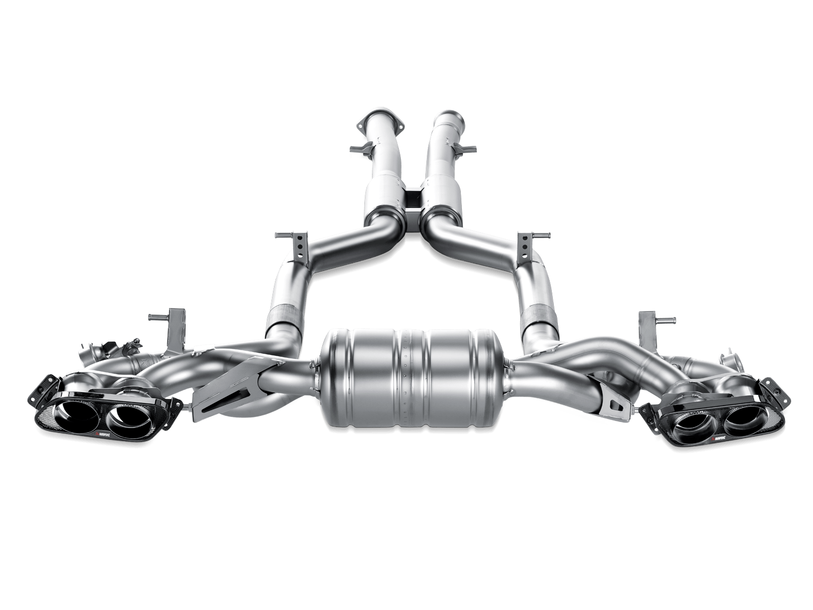Akrapovič has crafted a high-performance titanium Evolution exhaust system to further enhance this legendary performance car with a massive 6.3-liter V8. Made of our proprietary titanium alloy, the Evolution exhaust system is a “cat back” system. There are significant weight savings that aid handling and the power improvement is delivered across the rev range. The performance exhaust system further enhances the driving experience with the famed unmistakable deep resonant sound of Akrapovič, which is controlled with Akrapovic sound kitᙦfor exhaust valve control. When the valves are open, this powerful machine roars like a typical V8 muscle car. Complete the look with a pair of stunning handcrafted carbon fibre tailpipes with a special titanium alloy core.
