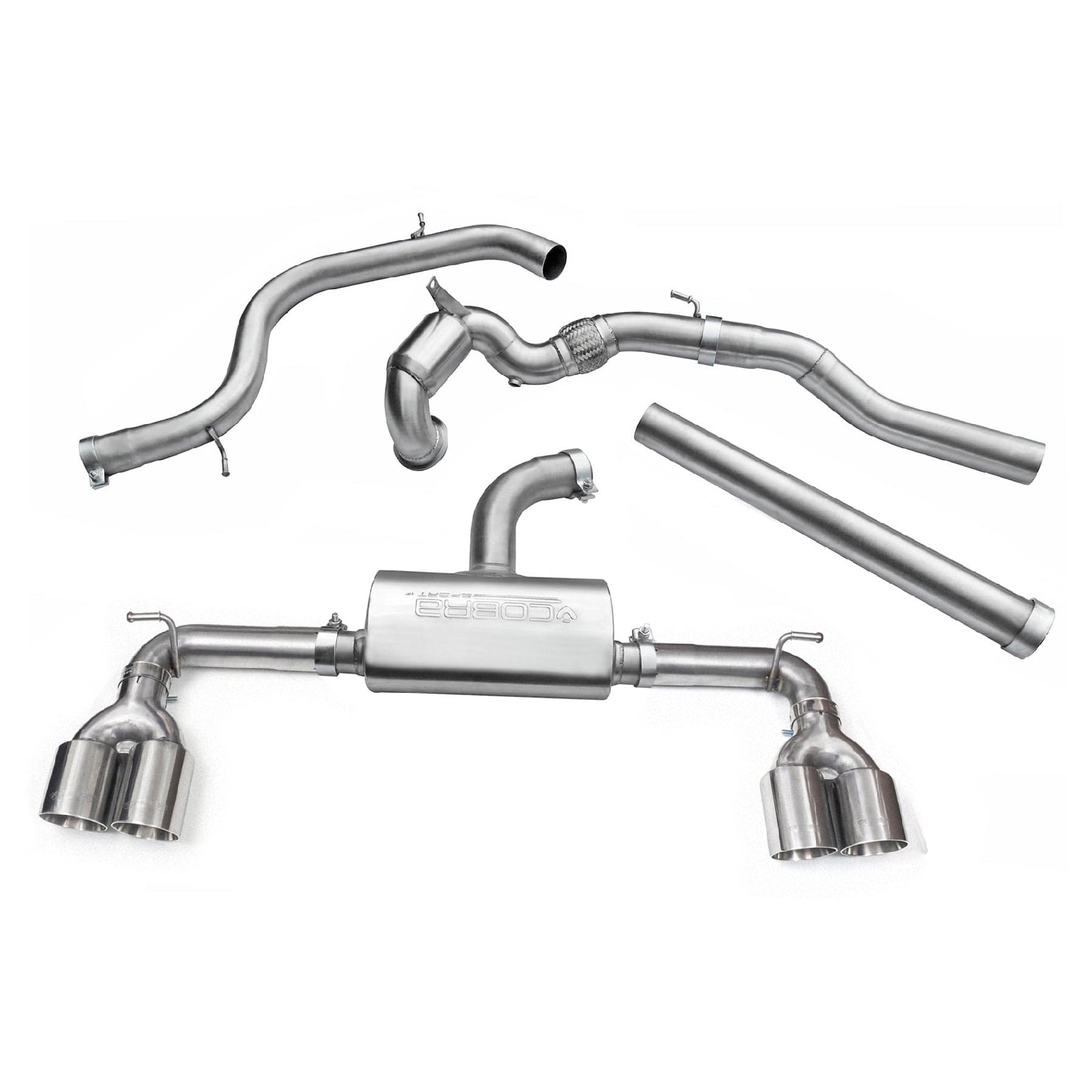 Fits: Mk7 GTi including GTi Performance Pack, Clubsport and Clubsport S models (additional quad exit panel required - see related items).Cobra Sport performance exhausts enhance the sound, looks and quality of your vehicle giving you the ultimate driving experience. Our sports exhausts range is fully guaranteed to give you assurance of our quality.This MK7 VW Golf GTI performance exhaust is made in 3"/76.2mm pipework and fits from the turbo backwards (Turbo back system) these exhausts replace the front pipe, standard catalyst, centre and rear sections.The high flow sports cat version will enable you to pass a UK MOT emissions test or police road side checks. The de-cat exhaust version is sold for motorsport and off road use only and will NOT be able to pass a UK MOT emissions test or police road side checks.The resonated sports exhaust includes the centre silencer and has a subtle but sporty tone. This exhaust is also available as a non-resonated version which is a louder option as it excludes the centre silencer and therefore, has a sportier exhaust note.Quad Exit Sports Cat Non-Resonated Turbo Back Test Results: