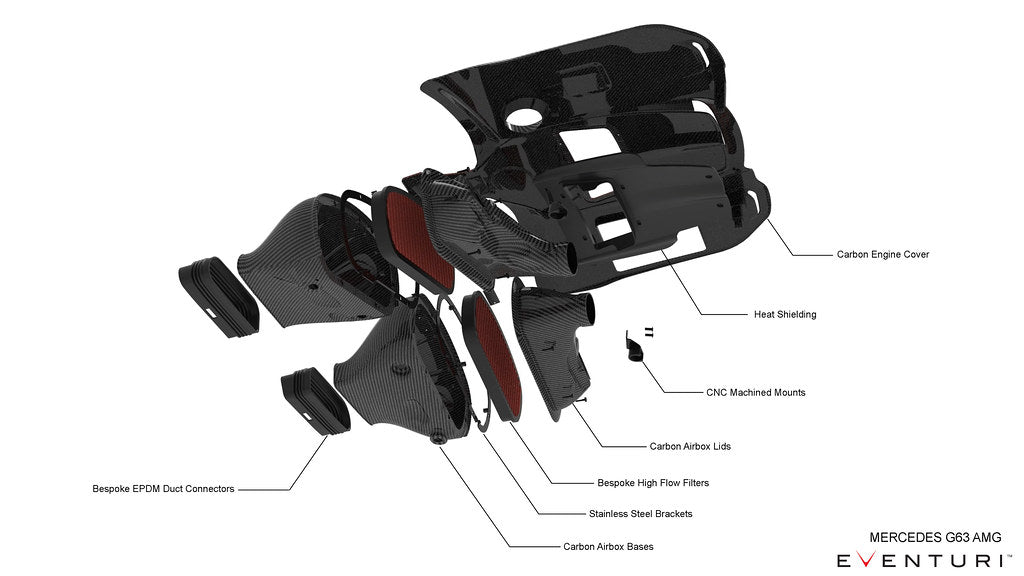 The G63 AMG W463A Eventuri Intake is precision-crafted from prepreg carbon fiber, featuring CNC machined components and custom-designed high-flow filters. This intake sets a new benchmark for performance gains in the aftermarket segment for this platform. By utilizing the additional space under the hood, we have significantly increased the intake volume, achieving an impressive 25% greater airflow rate compared to the OEM airboxes, all while retaining the original cold air feeds.