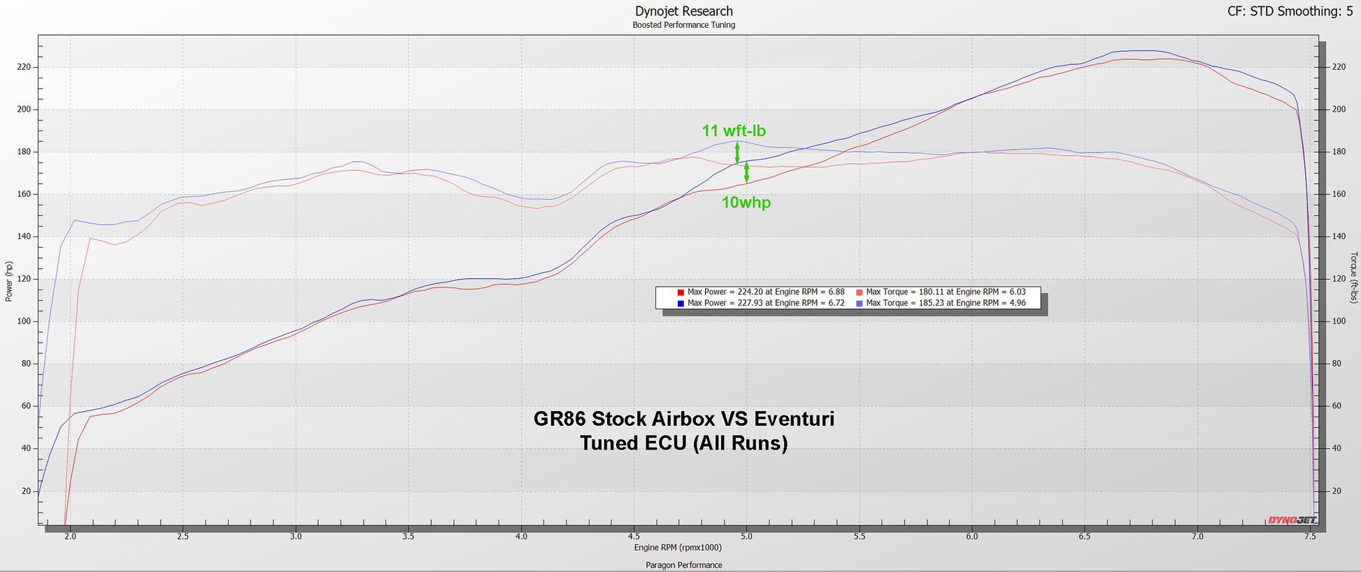 The GR86 Intake is a culmination of testing numerous configurations with over 125 dyno runs to arrive at an optimised design. We tested both stock and tuned cars to assess the impact of changing the intake for a less restrictive version. The NA 2.4L Boxer engine is sensitive to intake air temperatures so our initial priority was to ensure a fully sealed system. Dyno testing revealed a dip in power around 6000rpm on the stock ECU.